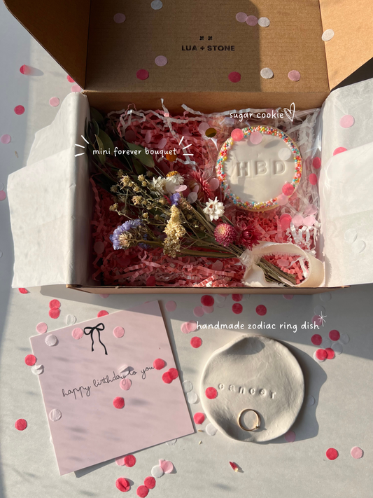 Birthday Gift Box for Her – Zodiac Dish, Flowers & Sugar Cookie